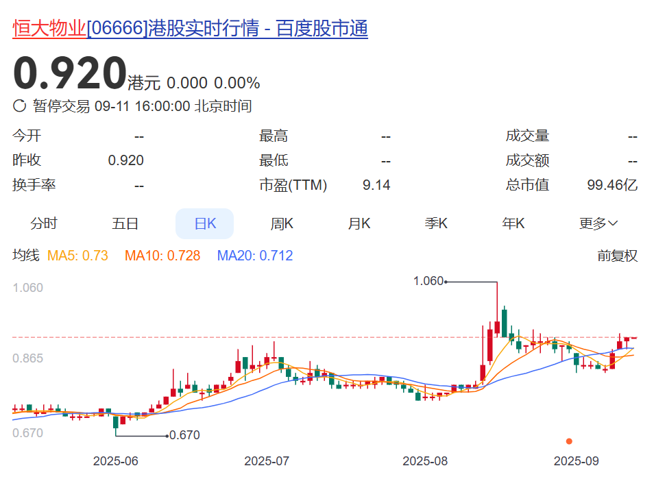 9月11日上午,恒大物业宣布停牌。停牌前,恒大物业股价不足1港元,总市值99.46亿港元(约合人民币91亿元)。