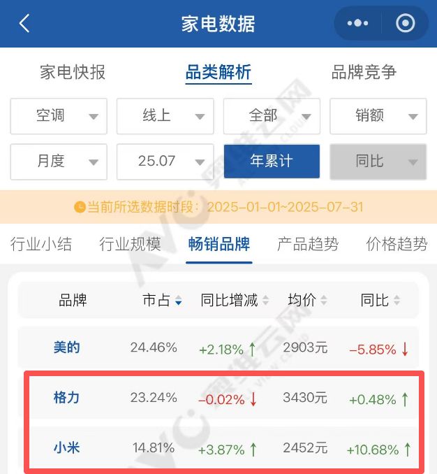 情况也很快迎来转折。格力电器市场总监朱磊晒出奥维云网同一项统计数据反击,称“我们也去奥维云网查了下,公开的数据和那几张截图并不一样。按照同样的查询条件,7月线上市场格力仍然保持领先”。